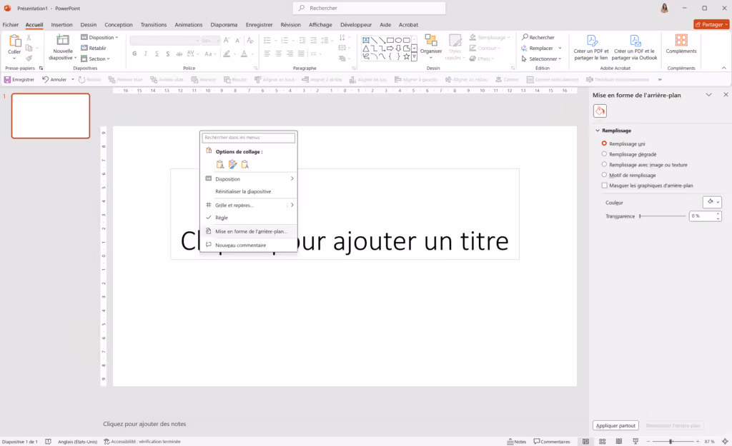 Commencez par ouvrir votre présentation PowerPoint. Clique droit, Cliquez sur "Mise en forme de l’arrière-plan", et vous accéderez à l’endroit où tout commence.