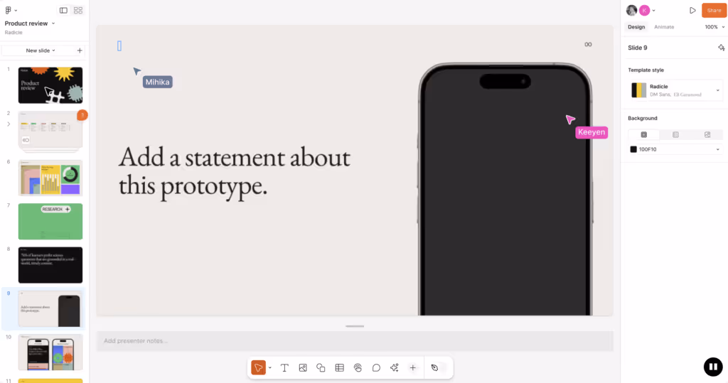 Pour les designers et graphistes, Figma Slides est une évidence. Imaginez des présentations professionnelles qui ressemblent à des portfolios vivants, avec des illustrations léchées et des animations élégantes.
