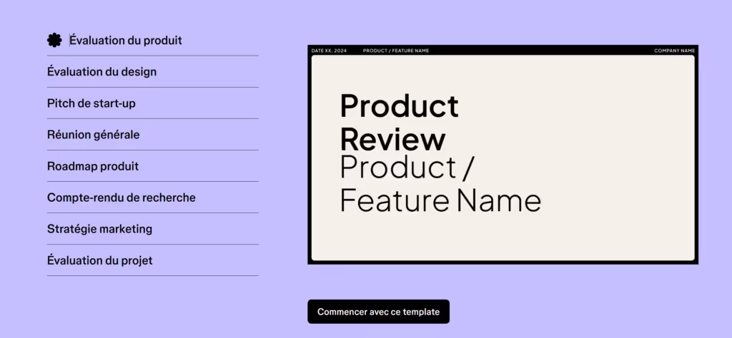 Vous ne savez pas par où commencer ? Pas de problème. Figma Slides propose une bibliothèque de modèles prêts à l’emploi adaptés à chaque type de présentation :