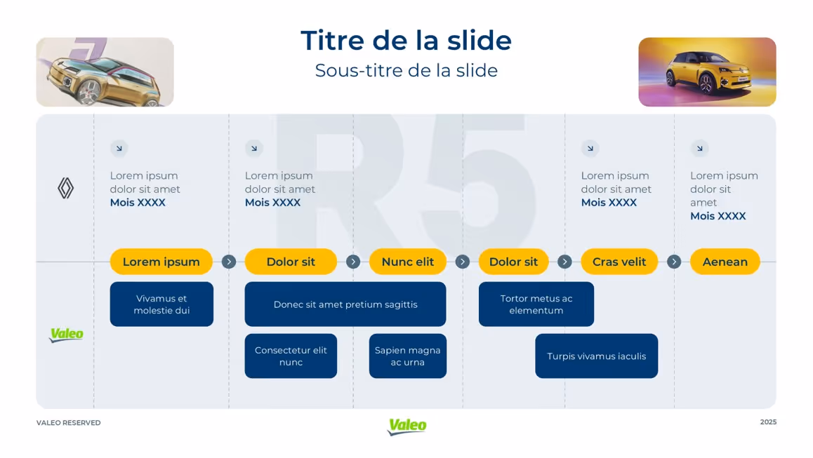 Cette slide fonctionne car elle présente la roadmap de manière linéaire et structurée dans le temps. La timeline horizontale permet de suivre facilement la progression du projet, étape par étape. Les jalons jaunes mettent en évidence les moments clés, tandis que les blocs bleus détaillent les actions associées à chaque phase. Les repères verticaux structurent les périodes et facilitent la lecture chronologique. Les images placées aux extrémités renforcent le contexte du projet et illustrent l’objectif final. L’ensemble crée une lecture logique : situation de départ, étapes intermédiaires et résultat attendu. Ce type de slide est particulièrement efficace pour expliquer les grandes phases d’un projet ou d’une transformation.