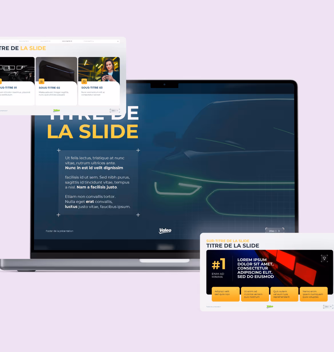 Nous avons conçu un projet entièrement sur-mesure, pensé à partir des besoins spécifiques de Valeo. L’objectif : proposer des slides à la fois engageantes, claires et structurées, tout en restant simples à prendre en main. Des slides facilement modifiables, conçues pour évoluer dans le temps et permettre une mise à jour rapide et autonome des contenus.