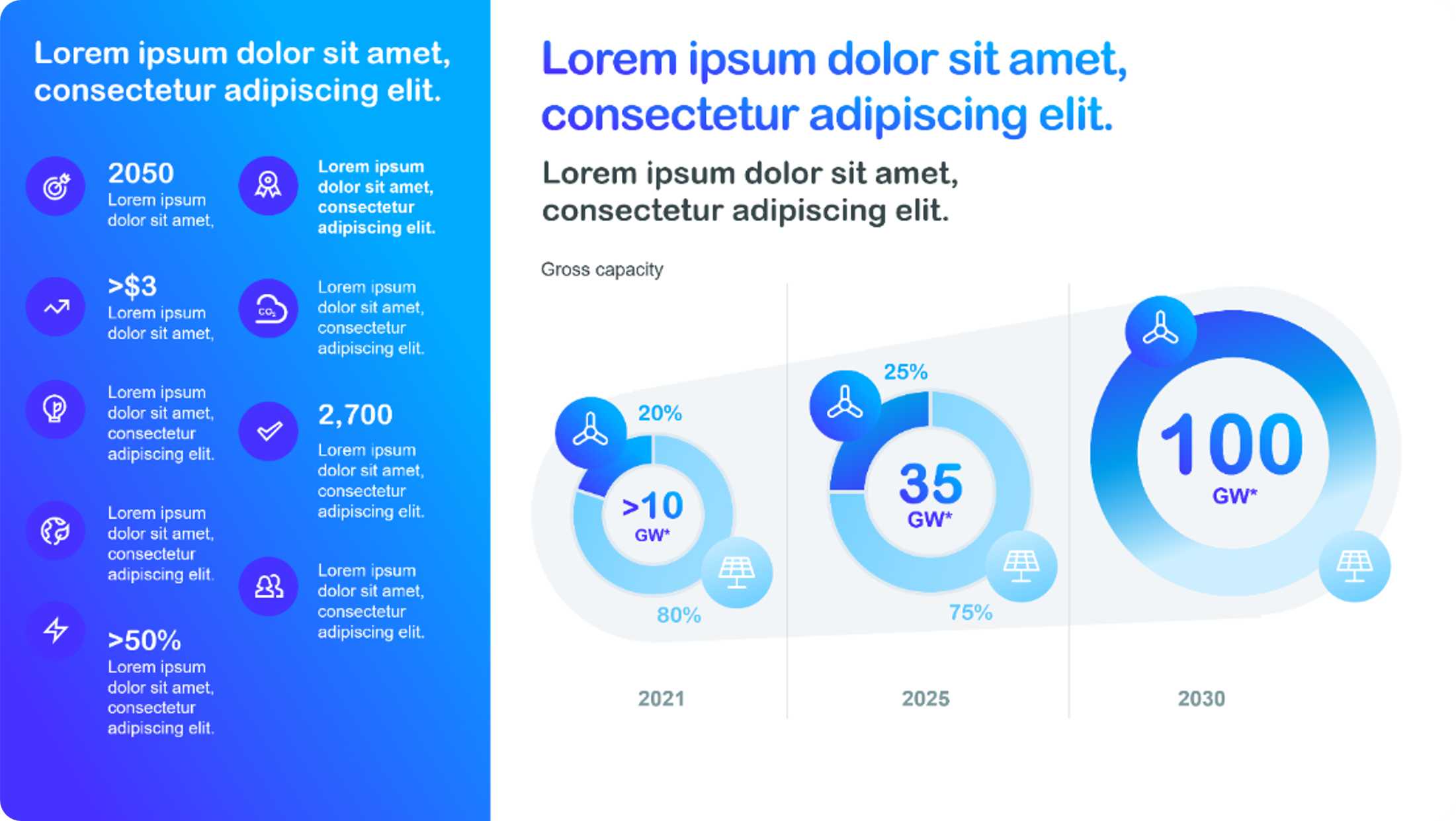 Cette slide fonctionne car elle combine une progression visuelle claire et des indicateurs faciles à lire. Les graphiques circulaires montrent l’évolution des capacités dans le temps (2021, 2025, 2030), ce qui permet de comprendre rapidement la trajectoire de croissance. Les valeurs clés sont mises en évidence au centre de chaque graphique, tandis que les couleurs et les pictogrammes aident à distinguer les différentes sources d’énergie. À gauche, une colonne d’indicateurs synthétiques apporte du contexte et renforce le message principal. L’ensemble crée une lecture fluide : contexte, évolution et objectif final.