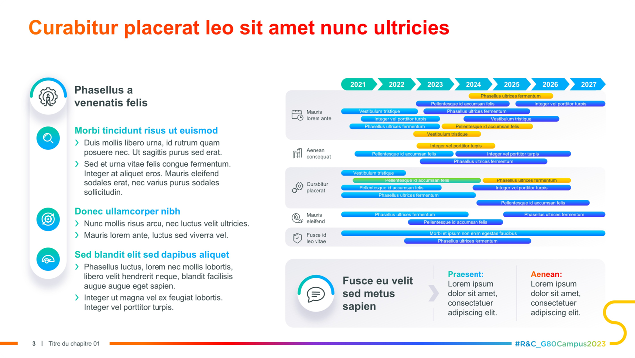 Cette slide roadmap fonctionne car elle visualise clairement la progression d’un projet dans le temps. La timeline en haut (2021 → 2027) structure immédiatement la lecture et permet de situer chaque phase. Les barres horizontales montrent la durée des différentes actions, ce qui aide à comprendre quelles initiatives se déroulent en parallèle et comment elles s’enchaînent. Les couleurs servent à distinguer les projets ou les étapes, tandis que les pictogrammes à gauche permettent d’identifier rapidement les différentes catégories d’actions. L’ensemble crée une lecture logique : le contexte et les objectifs à gauche, puis la planification détaillée au centre. Cette organisation rend la roadmap facile à comprendre pour un comité de direction ou une présentation stratégique.